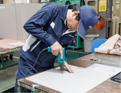 けがきでつけた印を元に、ドリルを使ってネジを通すための穴を開けていきます。